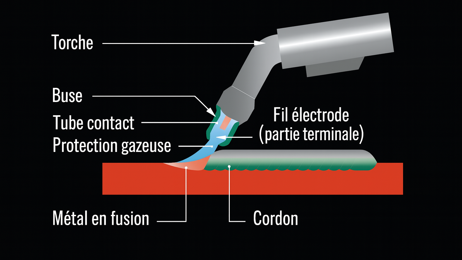 Principe : le fil-électrode fusible est entraîné en continu et fondu par l’arc électrique, protégé par un gaz inerte ou mixte.