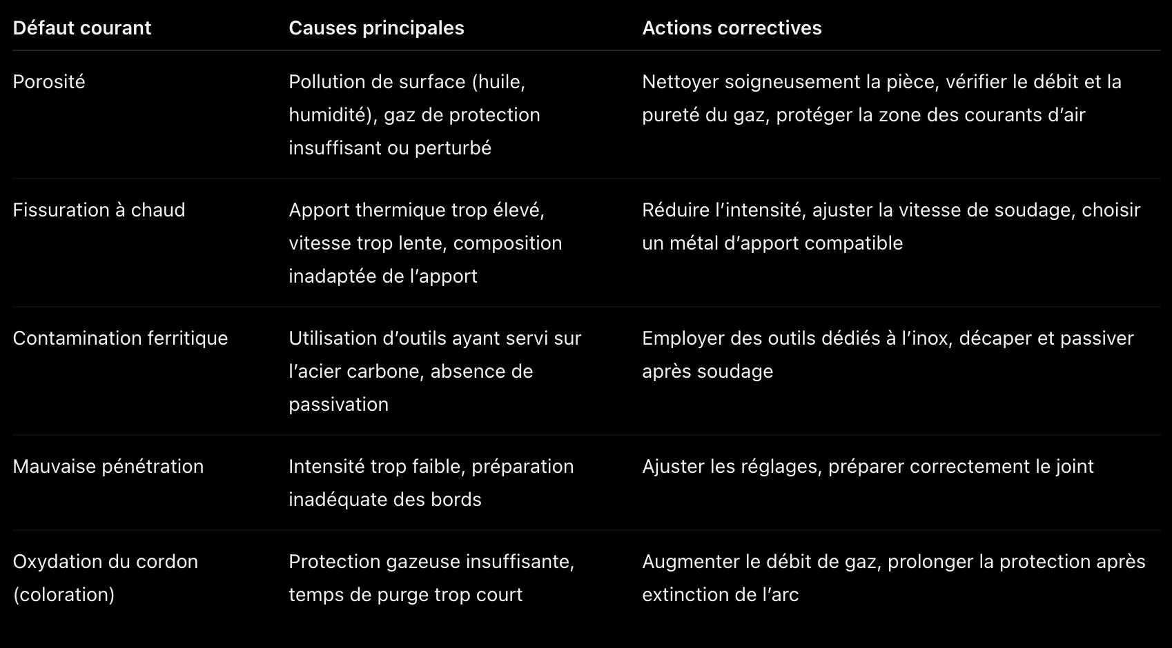 Défauts en soudage TIG